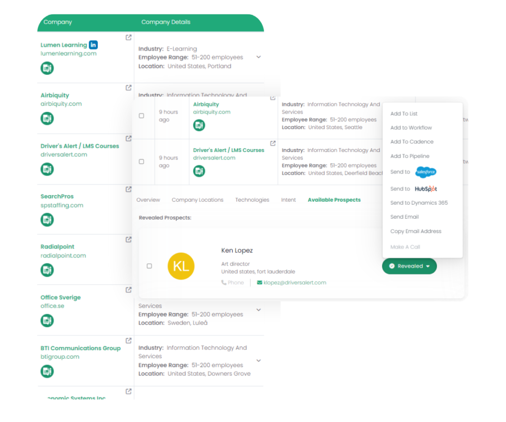 A single setup flow that creates a comprehensive buyer intent campaign, identifies targeted contacts, automates sales cadences, and jumpstarts success with 100 free leads – all within a lightning-fast, under 3-minute setup.